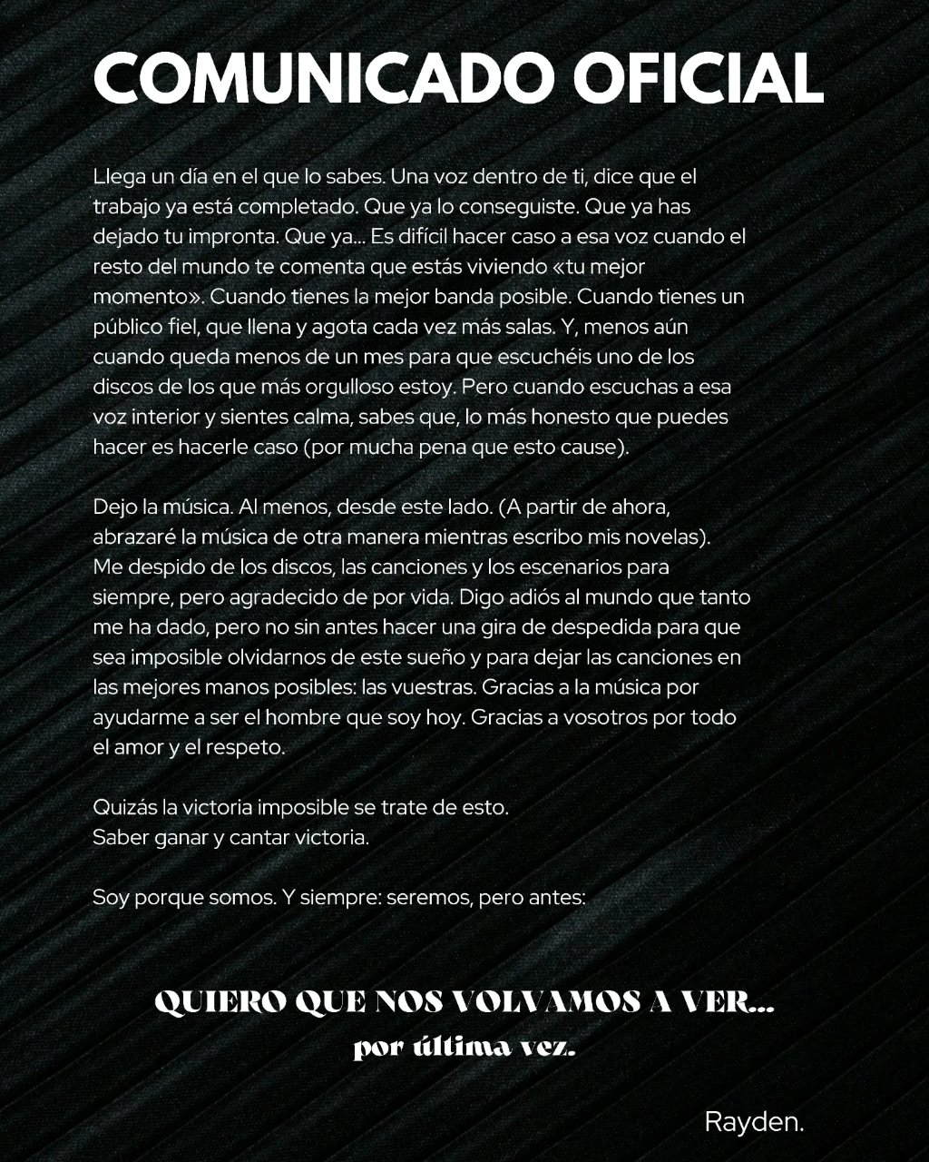 Rayden considera que su trabajo ya está completado y prefiere dedicarse a la literatura, una vocación tardía en la que ha encontrado buena parte de lo que no le daban los escenarios. El de Alcalá anunciaba a través de redes sociales que se marcha, justo después de comunicarlo a los medios de comunicación en una rueda de prensa.