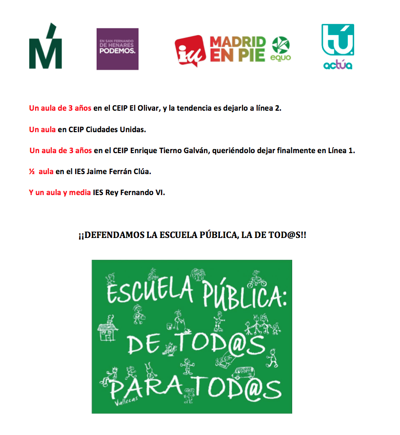 "Los partidos de izquierdas de San Fernando de Henares (Más San Fernando, Podemos, IU-Madrid en Pie-Equo-Anticapitalistas, y Actúa) nos oponemos frontalmente a este recorte (y, por supuesto, a la línea política privatizadora que lo sostiene), que no se justifica de ninguna manera, ya que lo único que conlleva es una mayor masificación de alumnado y un ataque, uno más, a la escuela pública de la región. En San Fernando de Henares, el Gobierno autonómico del PARTIDO POPULAR junto con CIUDADANOS, elimina para el próximo curso escolar: