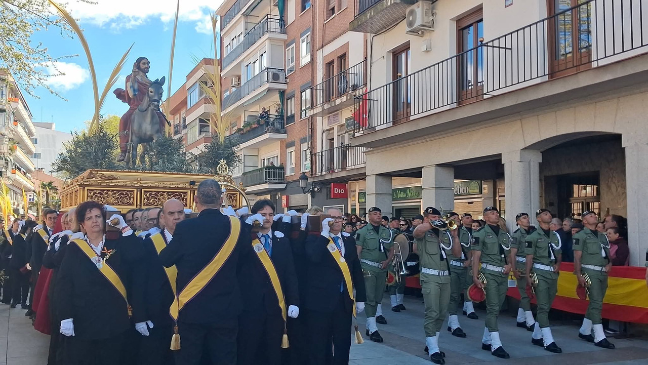 La Semana Santa de Torrejón comenzó este domingo por todo lo alto. La Borriquita se convirtió en la gran protagonista de la mañana del Domingo de Ramos, pero no fue la única. Desde las 9:45 horas, la Banda de Cornetas y Tambores de la BRIPAC anunciaba el inicio de una larga jornada, haciendo sonar sus tambores en un pasacalles que recorrió las calles de la zona centro hasta llegar a la Plaza Mayor.
