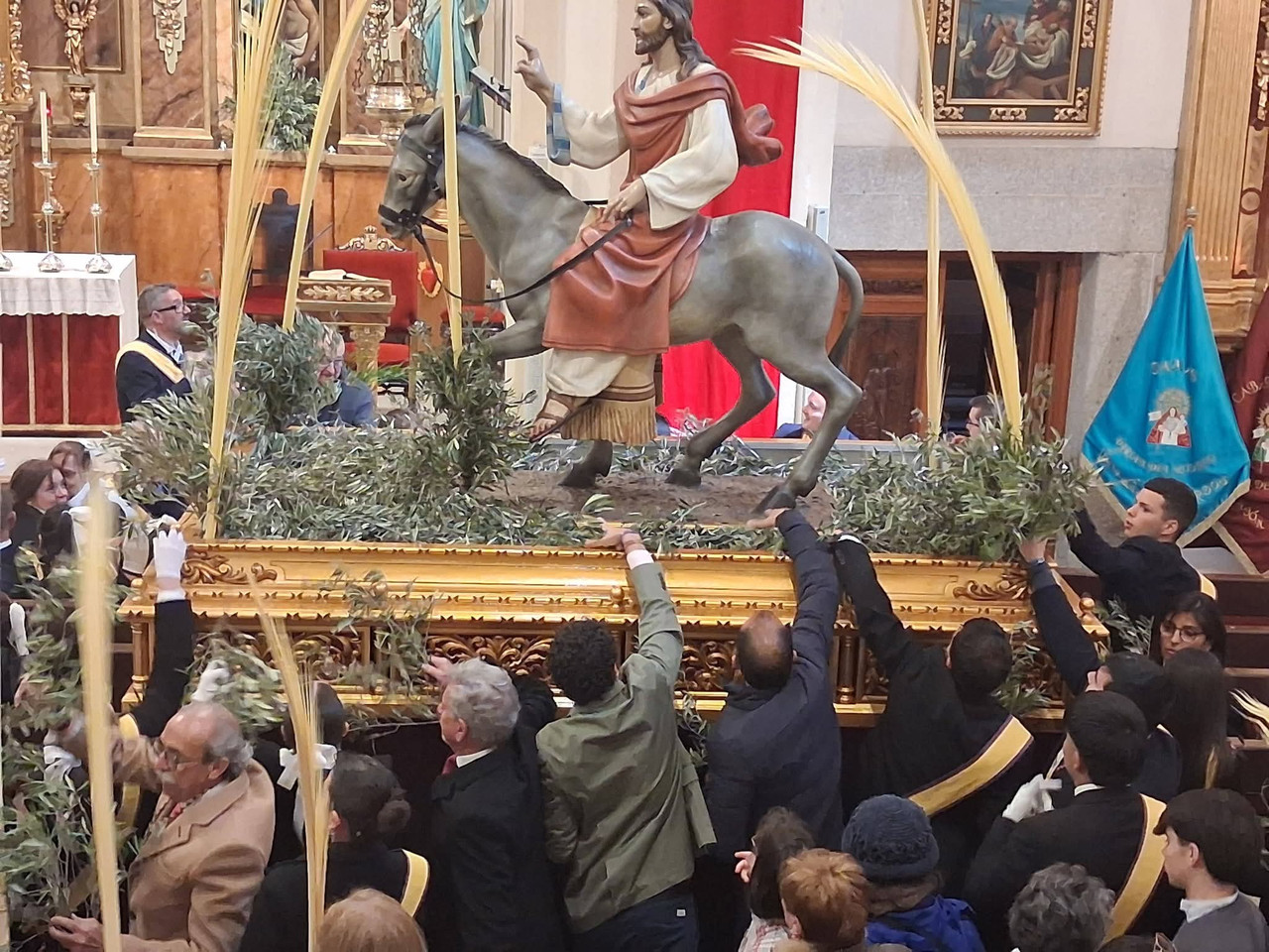 Bajo una gran carpa que ayudó a resguardarse del importante viento, se produjo el primer acto oficial de la Semana Santa torrejonera. El sacerdote bendijo los ramos para iniciar una corta procesión hasta el interior de la iglesia, donde se celebró la misa solemne del Domingo de Ramos. Un templo completamente abarrotado participó en una ceremonia amenizada por el coro de la Hermandad del Rosario.