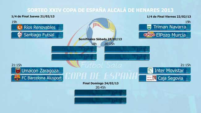 La Copa de España 2013 comenzará el jueves 21 de febrero a las 19:00 h con el Ríos Renovables – Santiago Futsal. A las 21:15 h se jugará el segundo partido de Cuartos de Final entre el Umacon Zaragoza y el FC Barcelona Alusport. El viernes 22 de febrero se disputará el Triman Navarra – ElPozo Murcia a las 19:00 h mientras que a las 21:15 h el Inter Movistar jugará debutará ante su afición con el Caja Segovia como rival. Los ganadores de la eliminatoria de Cuartos de Final del jueves se verán las caras en las semifinales, que darán comienzo el sábado 23 de febrero a las 18:00 h, y los vencedores de los partidos del viernes jugarán entre sí a las 20:15. La Gran Final de la Copa de España ‘Alcalá de Henares 2013’ tendrá lugar el domingo 24 de febrero a las 20:45 h. Todos los partidos serán ofrecidos en Marca TV.