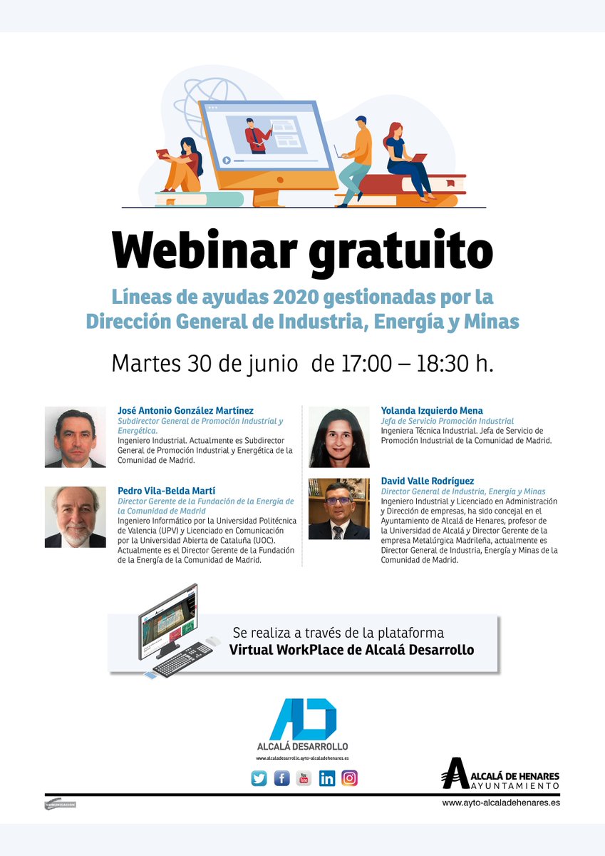 Alcalá Desarrollo organiza la próxima semana un evento virtual importante. Se trata de una sesión informativa ofrecida por el ente público en la que David Valle, Director General de Industria de la Comunidad Madrid, José Antonio González Martínez, Subdirector General de Promoción Industrial y Energética, Pedro Vila-Belda Martí, Director Gerente de la Fundación de la Energía de la Comunidad de Madrid y Yolanda Izquierdo Mena, Jefa de Servicio Promoción Industrial, van a exponer las nuevas ayudas que esta dirección general de la Comunidad de Madrid está poniendo en marcha.