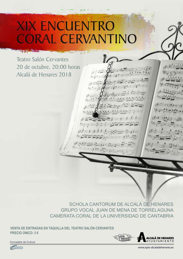 Este sábado tendrá lugar en el Teatro Salón Cervantes el XIX Encuentro Coral Cervantino que contará con la participación de la Schola Cantorum de Alcalá de Henares, la Camerata Coral de la Universidad de Cantabria y el Grupo Vocal Juan de Mena de Torrelaguna.