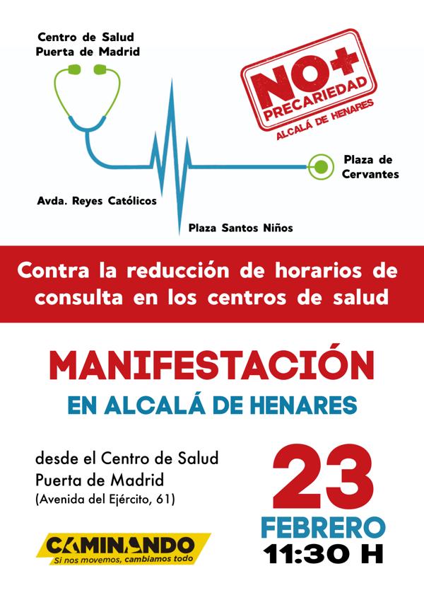 La plataforma No más Precariedad Alcalá de Henares ha convocado para hoy sábado, 23 de febrero, una manifestación en nuestra ciudad en contra de la reducción de horarios de consulta en los centros de salud de la Comunidad de Madrid y los recortes sanitarios, que saldrá a las 11:30 horas del Centro de Salud Puerta de Madrid.