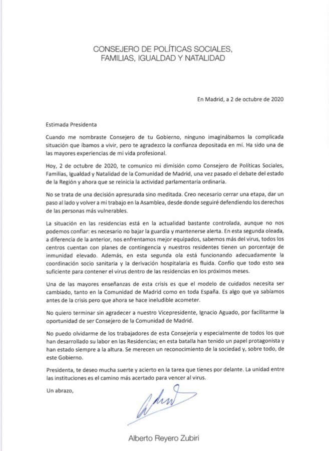 Tras una tarde informativamente apasionante, saltaba la sorpresa en el Gobierno de la Comunidad de Madrid, pues Alberto Reyero, Consejero de Servicios Sociales del ejecutivo de Ayuso presentaba su dimisión pocos minutos antes de comenzar el confinamiento de las ciudades.