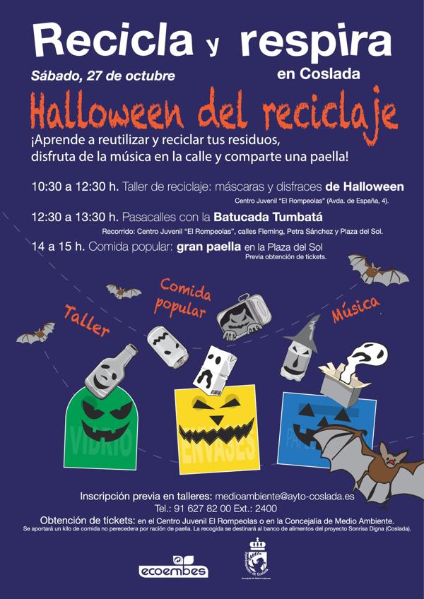 Este sábado, día 27 de octubre, la Concejalía de Medio Ambiente del Ayuntamiento de Coslada ha preparado una iniciativa destinada a toda la familia. Se trata de un Taller de Elaboración de Disfraces de Halloween. El único y principal requisito es que, para su fabricación, se utilicen materiales reciclados. La actividad, que tendrá lugar en El Rompeolas de 10.30 a 12.30 horas, se completará con un pasacalles que acompañado por una batukada servirá para que las y los niños que participen puedan mostrar sus creaciones en el desfile.
