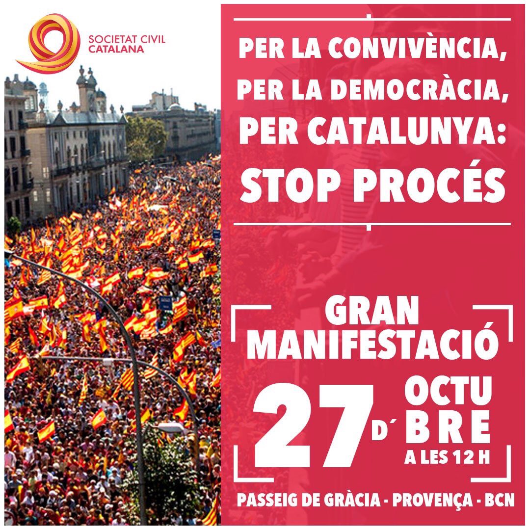 Bajo el lema “Por la convivencia, por la Democracia, por Cataluña: stop proceso”, esta manifestación constituye una acción de todos los constitucionalistas por la vuelta a la legalidad y el cierre de la fractura social en Cataluña.