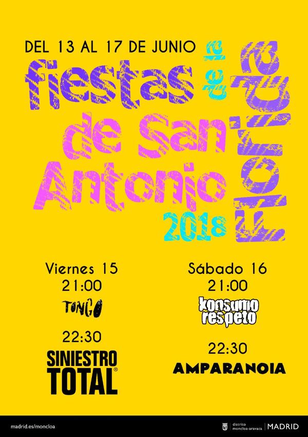 La música será una de las grandes protagonistas en el programa de las fiestas de San Antonio de la Florida en el que se encontrarán grandes estrellas como los grupos Siniestro Total (viernes 15) y Amparanoia (sábado 16). El Distrito de Moncloa-Aravaca una vez más ha querido dar la oportunidad de dar a conocer nuevos valores. El jueves 14 será el turno de los ganadores del III Concurso de Música Joven convocado por el distrito. Como solistas se podrá escuchar al chileno Matías Schulze “Bocho” que tras ser vocalista de Hotel Julieta busca una nueva oportunidad en solitario y a Álvaro Muñoz.