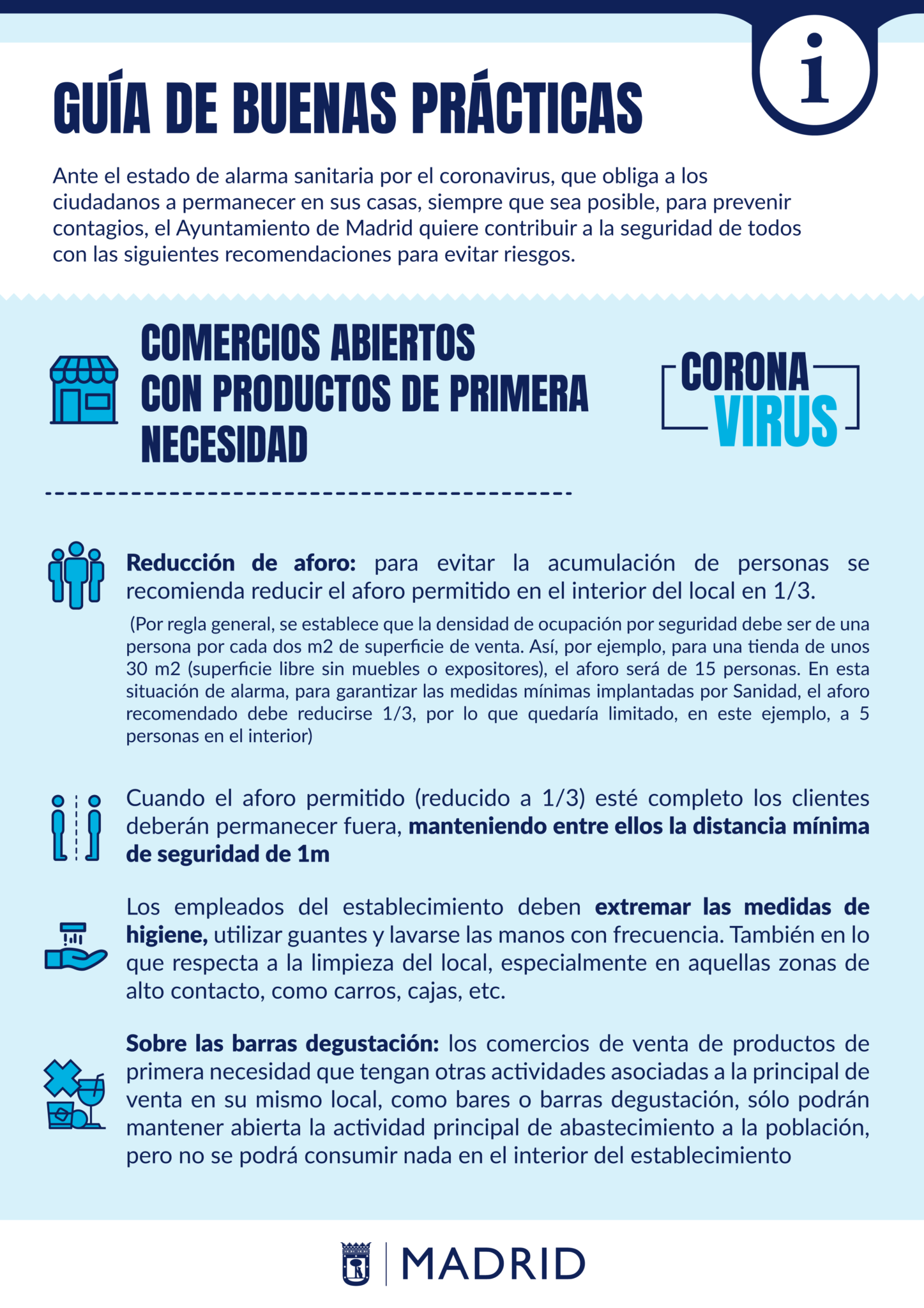 El Ayuntamiento de Madrid, a través del Área de Desarrollo Urbano, ha elaborado una lista de buenas prácticas con el fin de reducir riesgos tanto para los trabajadores que siguen atendiendo a los ciudadanos en los comercios que venden productos de primera necesidad como para los clientes que tienen que salir a la calle a comprar durante el estado de alarma. Son consejos basados en criterios técnicos y en la experiencia de las medidas que han ido adoptando estos días por iniciativa propia muchos locales.