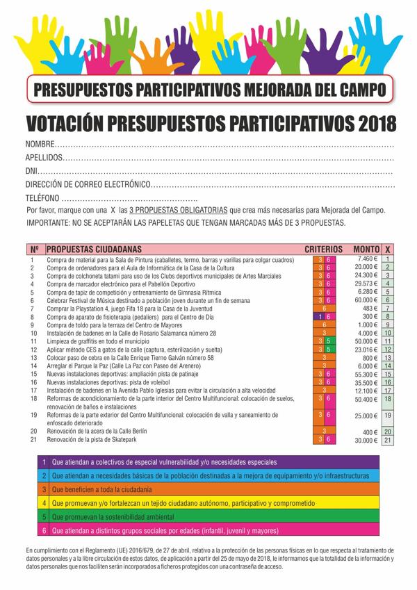 Todos los ciudadanos mayores de 14 años que vivan en Mejorada están llamados a votar estas propuestas, y deben marcar en su voto 3 propuestas para que la votación sea válida. En Mejorada comenzaron los Presupuestos Participativos en noviembre de 2011, con la constitución del "Grupo Motor" y el apoyo de la Universidad Complutense que estuvo formando a ese grupo motor durante los primeros pasos.