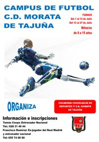 La Concejalía de Deportes del Ayuntamiento de Morata de Tajuña ha llegado a un acuerdo con el Club Deportivo Morata y el Club Deportivo Moscardó, para la organización durante las dos quincenas del mes de Julio de un Campus de Futbol en el Campo Municipal del Bosque de Morata de Tajuña.