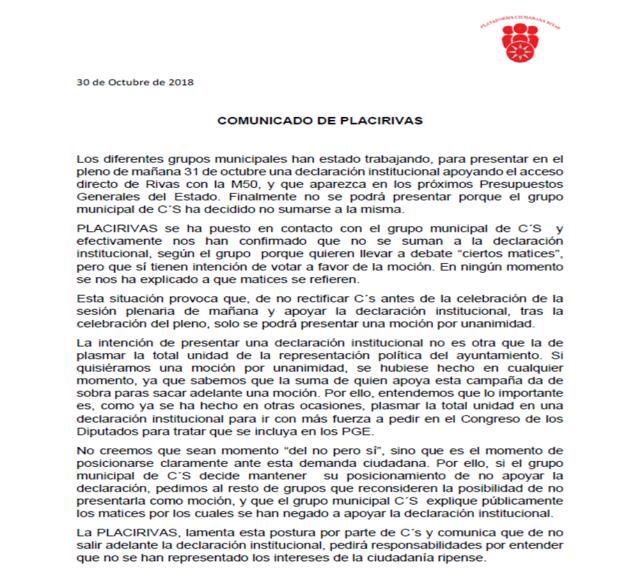 En la tarde de ayer, y por vía de urgencia, la Plataforma Ciudadana de Rivas emitía un comunicado advirtiendo de lo que va a ocurrir en el Pleno de la localidad que se celebrará hoy. Y es que, tal y como contaban, Cs había decidido no firmar la Declaración Institucional en la que se pedirá, de forma oficial, que el nuevo acceso a la M-50 sea incluido en los Presupuestos de 2019.