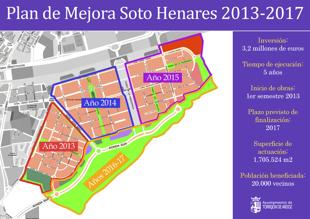 El alcalde de Torrejón de Ardoz, Pedro Rollán, ha presentado el Plan de Mejora Soto Henares 2013-2017 en el Paseo de la Fraternidad de este nuevo barrio de la ciudad. El regidor ha estado acompañado de la presidenta de la Asociación de Vecinos de Soto Henares, Marta Peiró, con la que el Ayuntamiento está trabajando en la confección de este ambicioso programa de mejoras al que se va a destinar un total de 3,2 millones de euros.
