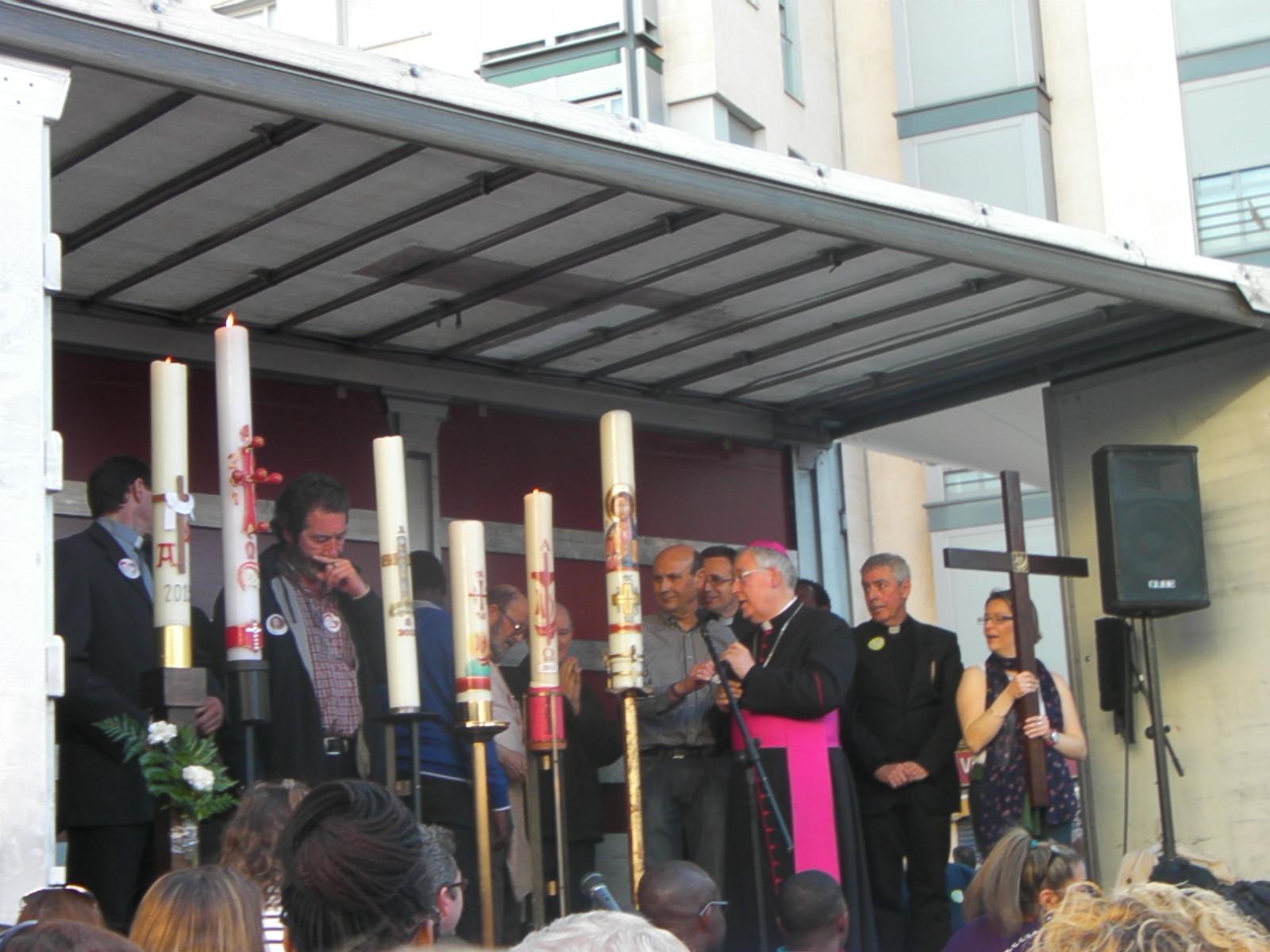 Reig Pla llegó para recibir a los ocho Cirios Pascuales de las Parroquias torrejoneras, que también subían al escenario, junto a sus párrocos, y lo hizo para, lejos de todo protocolo, contar a los allí reunidos como fue su despertar a la fe. El Obispo explicaba que entró en el seminario por una apuesta, y que, a pesar de intentar escapar a la semana, acabó recibiendo la Llamada que le convertiría en sacerdote.