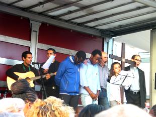 El acto continuaba con más canciones y la participación de un coro llegado desde Guinea, que, debido a lo reducido del escenario, tuvo que actuar en el suelo de la Plaza. Cerca de las ocho y media de la tarde, y cuando el Sol comenzaba a declinar, el acto terminaba con un fuerte aplauso.