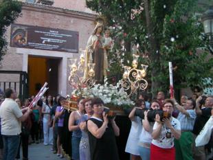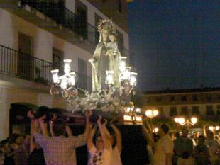A eso de las nueve y media de la tarde los fieles abandonaban la Iglesia, y lo hacían para acompañar a la Virgen en un pequeño recorrido por las calles adyacentes a la Plaza. Portada por las Hermanas de la Virgen, la talla carmelita salía por la Puerta del Sol de la Parroquia de San Juan Evangelista mientras sonaban los acordes del himno de España. Nada más salir del recinto eclesiástico, una gran lluvia de pétalos bañaba a la imagen entre los aplausos de los vecinos.