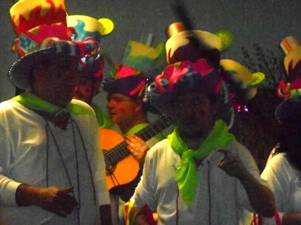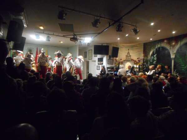 Y los torrejoneros no quisieron perderse la puesta de largo de las agrupaciones, abarrotando la sede de la Casa de Andalucía en una tarde que invitaba a quedarse en casa. Así, algo después de las siete de la tarde comenzaba la actuación de La Comparsa Clandestina, que se presentaban con el nombre de “Los liantes” y un tipo de Cupido, y ofrecían una actuación en la que destacaron unos cuplés enjaretados que iban contando una historia, y un pasodoble dedicado a la doble identidad madrileña y andaluza.