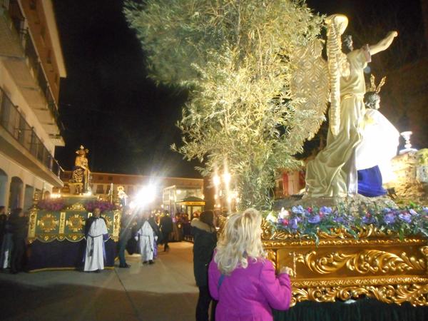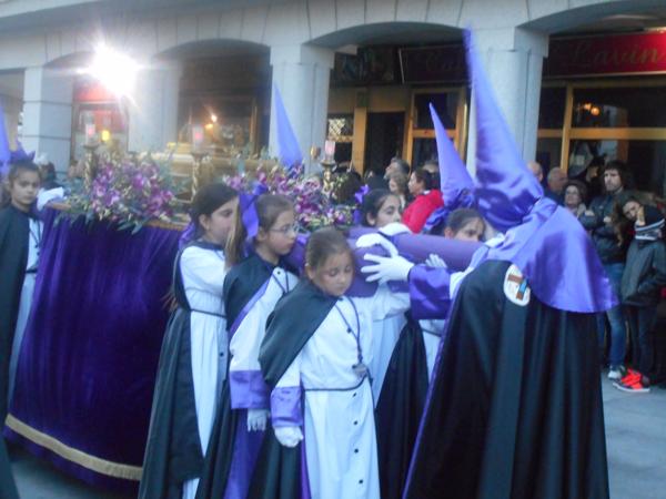 Y, tras entrar en la iglesia, comenzaba el desfile, con la primera “levantá” de los minicostaleros, primera de muchas a lo largo de las casi dos horas de viaje que iban a realizar por las calles de Torrejón. Y es que, a pesar de que la procesión fue algo más larga que el año anterior, los anderos del paso infantil no tuvieron problema en completar el recorrido llegando con fuerzas, incluso, para llevar a pulso hasta el fondo de la parroquia el paso de “La Santa Cena”.