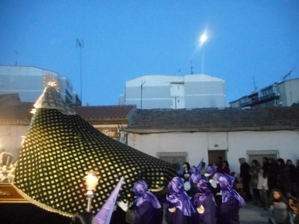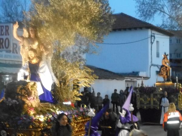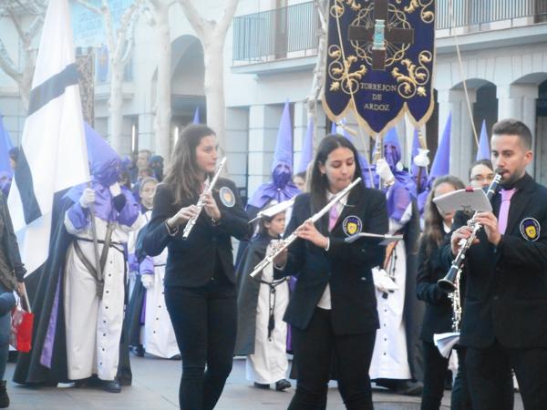 Junto a ellos, 24 anderos “mayores” se encargaban de portar a la Virgen de la Soledad, titular de la Hermandad, y protagonista de las procesiones de la Semana de Pasión torrejonera. También ellos, como ya es tradición, llevaban a la Virgen a pulso hasta el interior de la iglesia antes de soltarla y fundirse en un abrazo.