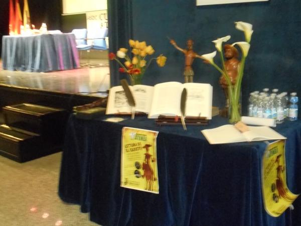 Así una mañana nublada, pero apacible, recibía al tejido cultural, social y político de la localidad a las once de la mañana en el Salón de Actos de la Casa de la Cultura, y lo hacían para asistir al comienzo de una lectura del Quijote que cumplía 17 años, y que lo hacía de forma especial. Así, el Grupo de Teatro Atenea aparecía de entre el público para subirse al escenario representando personajes típicos del Siglo de Oro.