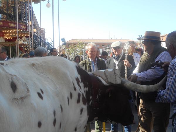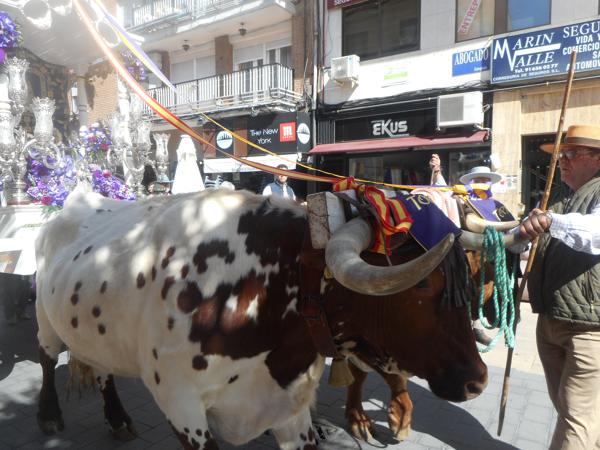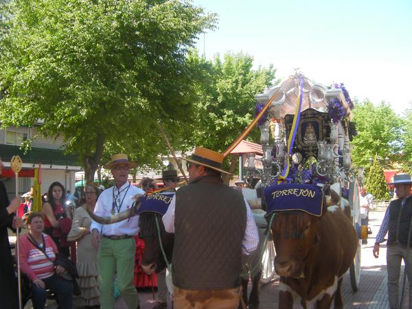 Y es que la mañana acompañaba, con un sol de primavera que hizo que muchos torrejoneros se acercasen hasta la Plaza para vivir la XXVI salida rociera de la Hermandad. Y, tras la salida, tocaba enyugar los bueyes, que iban a ser los encargados de llevar la Carreta por las calles de Torrejón. Una carreta, por cierto, que estaba de estreno, ya que se habían colocado dos guirnaldas realizadas por el orfebre Emilio Méndez, de la localidad de Pilas.