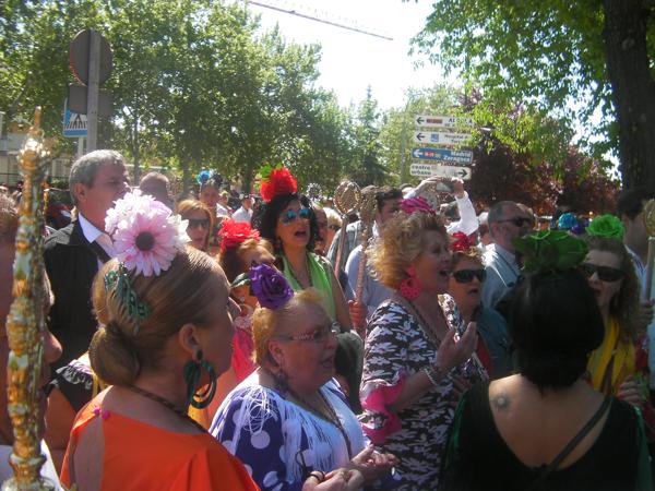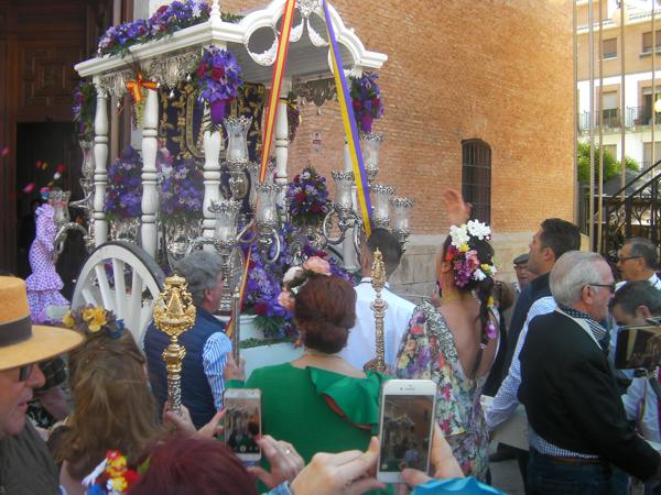 Pero la romería comenzaba unas doce horas antes, cuando los miembros de la Hermandad del Rocío se congregaban en la Parroquia de San Juan Evangelista para celebrar la Misa de Romeros. Con algo de retraso sobre el horario previsto, a las once de la mañana, la Carreta del Simpecado abandonaba la iglesia por la Puerta principal, y lo hacía entre cantos, lanzamiento de pétalos y “vivas” a la Virgen, y lo hacía rodeada por vecinos y rocieros que no dudaron en hacer “corrillo” alrededor de la imagen.