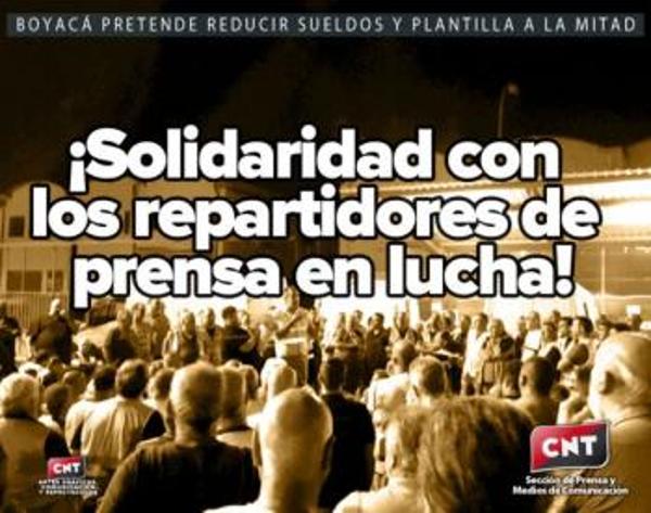 "Boyacá, grupo empresarial que se ha quedado con el monopolio del reparto de prensa escrita en la Comunidad de Madrid, ha ido creando un opaco entramado de empresas con las que disolver su responsabilidad para con sus empleados, generando una situación insostenible en la que se mezclan los falsos autónomos, las cesiones ilegales y se precariza el empleo. Por si fuera poco, ahora en una nueva vuelta de tuerca, no exenta de chulería y prepotencia, intenta reducir el personal a la mitad y bajar los sueldos para seguir aumentando sus beneficios empresariales. Frente a esa situación, los ‘ruteros’, nombre con el que popularmente se conoce a los repartidores de prensa, han decidido plantarse, convocar huelga y hoy los kioscos han despertado sin publicaciones diarias. Pero la movilización no se detiene ahí: los trabajadores han anunciado que van a seguir peleando hasta las últimas consecuencias en la defensa de unos puestos de trabajo de los que dependen cerca de 300 familias. Desde la sección de Prensa de CNT (Sindicato de Artes Gráficas, Comunicación y Espectáculos), apoyamos las justas reivindicaciones de nuestros compañeros repartidores, así como la del resto del colectivo y hacemos un llamamiento al resto de trabajadores y trabajadoras de la prensa para romper con los compartimentos estancos en que nos quieren encerrar desde las empresas y coordinar luchas con las que plantear una respuesta eficaz y unitaria de todo el sector. Igualmente, instamos al público lector a entender las razones de la huelga y a solidarizarse con la justa lucha de los repartidores. Por último, queremos ofrecer todo nuestro cariño y deseo de pronta recuperación al compañero que ha tenido que ser hospitalizado cuando participaba en el encierro de la nave de Torrejón de Ardoz, un hecho que debería hacer ver a Boyacá que los trabajadores no son números ni estadísticas y que con su actitud rastrera está jugando con las vidas de personas con nombre y apellido", contaba CNT.