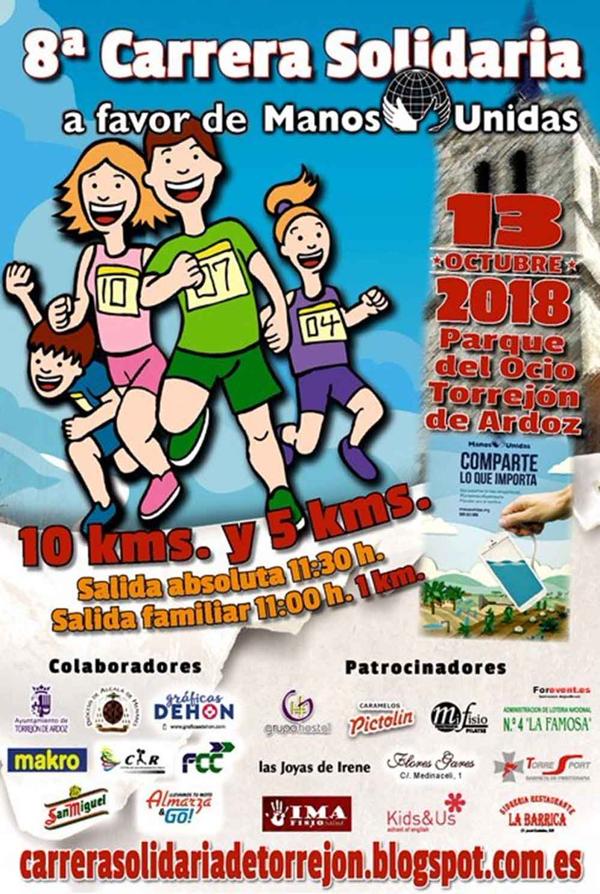 Con motivo de la 59º campaña nacional de Manos Unidas que se celebra durante este 2018 con el lema “Comparte lo que importa”, las parroquias de Torrejón de Ardoz vuelven a organizar esta carrera que tendrá lugar el próximo 13 de octubre en el Parque de Ocio de Torrejón de Ardoz y que consta de dos pruebas. Una en categoría absoluta en la que podrán participar corredores desde los 17 años en adelante, que realizarán un recorrido de cinco o diez kilómetros con salida a las 11:30 horas y otra para los más pequeños y las familias de 1 kilómetro de distancia, que comenzará a partir de las 11:00 horas. La entrega de trofeos está prevista para las 12:45 horas. La inscripción se puede realizar el mismo día de la Carrera y en la página web: http://carrerasolidariadetorrejon.blogspot.com.es, Los dorsales se podrán recoger el jueves y viernes (11 y 12 de octubre) en horario de 17:00 a 20:00 horas en el Hotel Aída. |