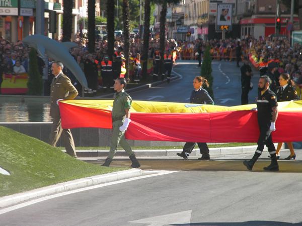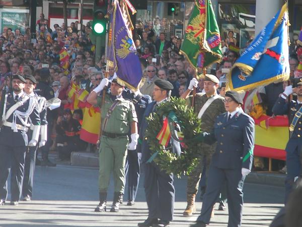 Juntos pasaron revista a las tropas antes de que hiciese acto de presencia la enseña nacional portada por representantes de todos los cuerpos presentes en el desfile. Con los acordes del himno la bandera fue subiendo al mástil de Plaza de España ante la mirada de las miles de personas que llenaban los alrededores. Tras el izado tocaba recordar a los caídos, algo que se hizo como manda la tradición: cantando “La Muerte no es el final” mientras los políticos colocaban una corona de laurel a los pies del mástil de la bandera. Este segmento terminaba con una salva de disparos y el sobrevuelo de dos F-18.