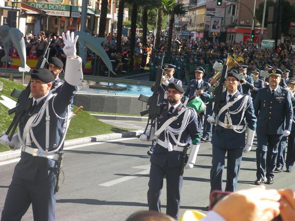 Precisamente estos dos aviones eran los encargados de abrir el desfile de tropas, un desfile con mayor presencia militar que en otras ocasiones, y en el que participaron también las unidades caninas de la Policía Local y la Policía Nacional. Y para cerrar la comitiva a eso de las doce y diez hacían acto de presencia los componentes de la Banda de Gaitas de Madrid “Lume de Biqueira”, que desfilaron ante los que llenaban la Avenida de la Constitución.