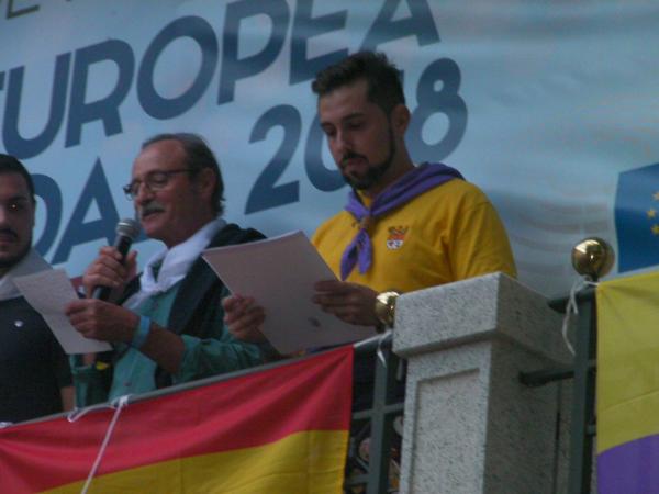 Desde el balcón, exactamente igual que se hizo con la inauguración de los Angeles Anunciadores, el Presidente de la Asociación de Gigantes relató todo lo ocurrido en los últimos cinco años, en que una recién nacida asociación gigantera ha triplicado el número de sus socios. Pero la nostalgia no fue lo único que llenó el balcón del Ayuntamiento, pues junto a David Girona se situó el hombre responsable de que la comparsa de Gigantes de Torrejón haya vuelto a la vida: el artesano gigantero Toni Mujal.