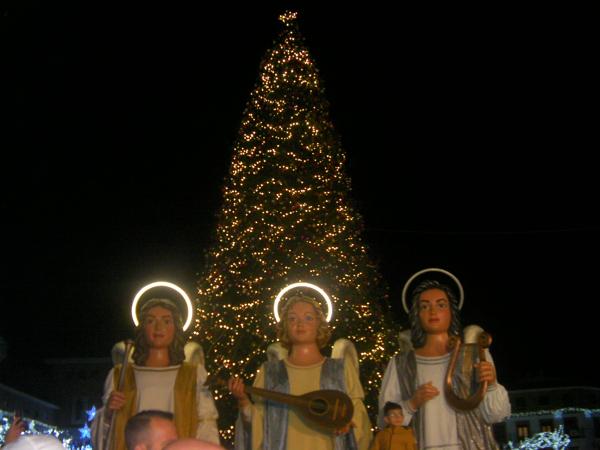 Y a continuación, también en la Plaza, tocaba recibir, como auténticas estrellas a los duendes de la Navidad. Mientras comenzaba el primer pase de la Ciudad de los Sueños (ambientada en el cuento de Peter Pan), los Guachis se subieron al escenario para cantar y bailar con los niños sus canciones. La actuación de los Guachis no fue la única participación de la comparsa de Gigantes, pues los tres Ángeles Anunciadores adelantaron su visita para abrir una comitiva oficial que llevó los actos hasta el Recinto Ferial.