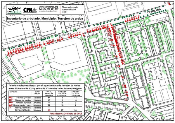 La cercanía de las elecciones ha provocado un considerable incremento en el número de obras que se realizan en las calles de Torrejón, y casi todas ellas han tenido un denominador común como es la tala masiva de árboles y arbustos en los últimos meses. Como ejemplo la Asociación ecologista CNP Alerce denunciaba lo ocurrido durante la renovación de una acera en la calle Solana, una obra que se ha llevado por delante 86 árboles, alguno de ellos con varias décadas de vida.
