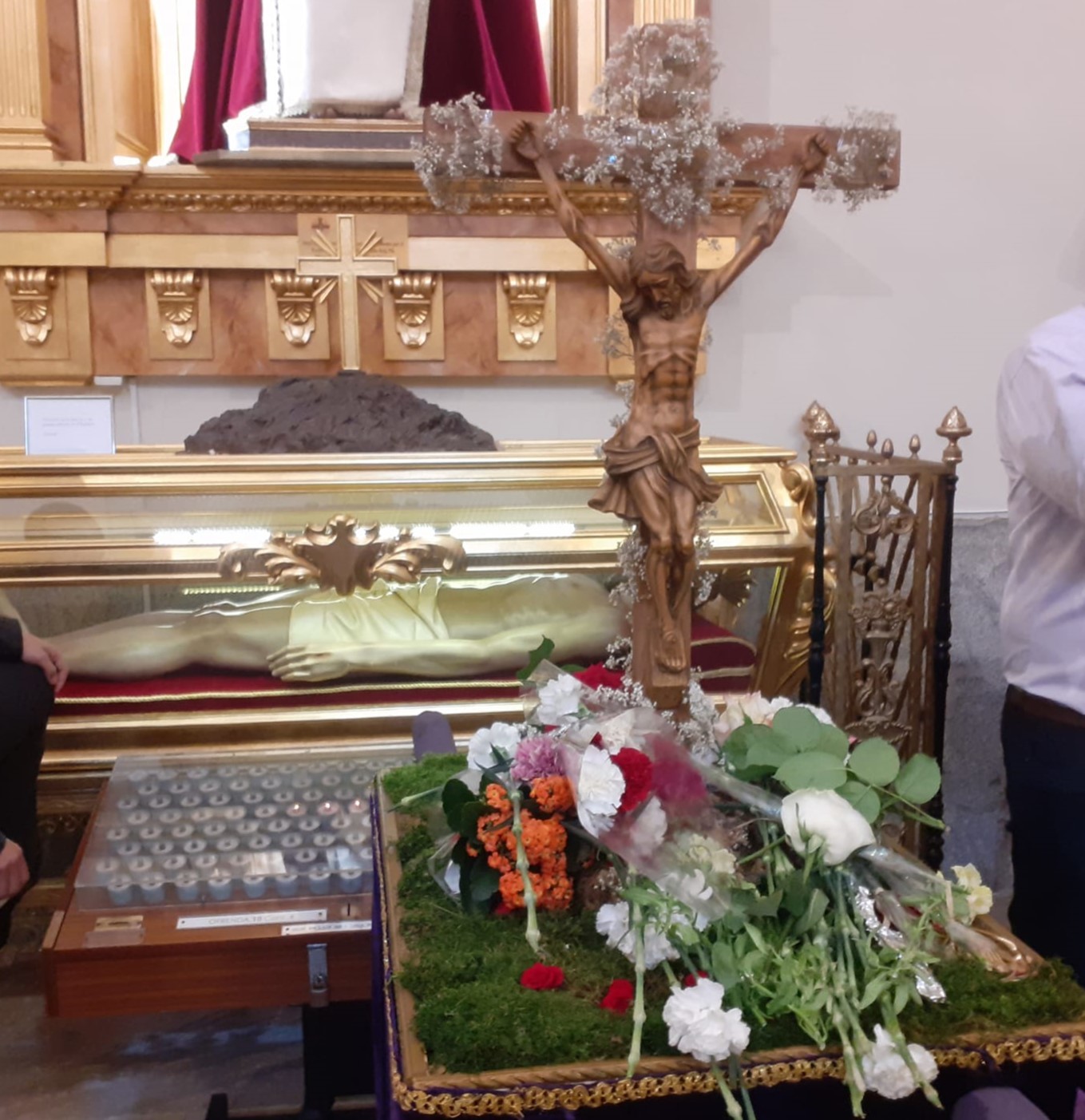 Al llegar de nuevo al Altar Mayor comenzaba una ofrenda floral que ponía final a la celebración. Y es que la relación de la Vera Cruz con el Rocío se ha incrementado desde hace dos años, pues no hay que olvidar que la Hermandad rociera de Torrejón fue su madrina en la Coronación de la Virgen de la Soledad, una coronación, por cierto de la que se acaban de cumplir dos años, y que celebrará la Hermandad el próximo jueves.