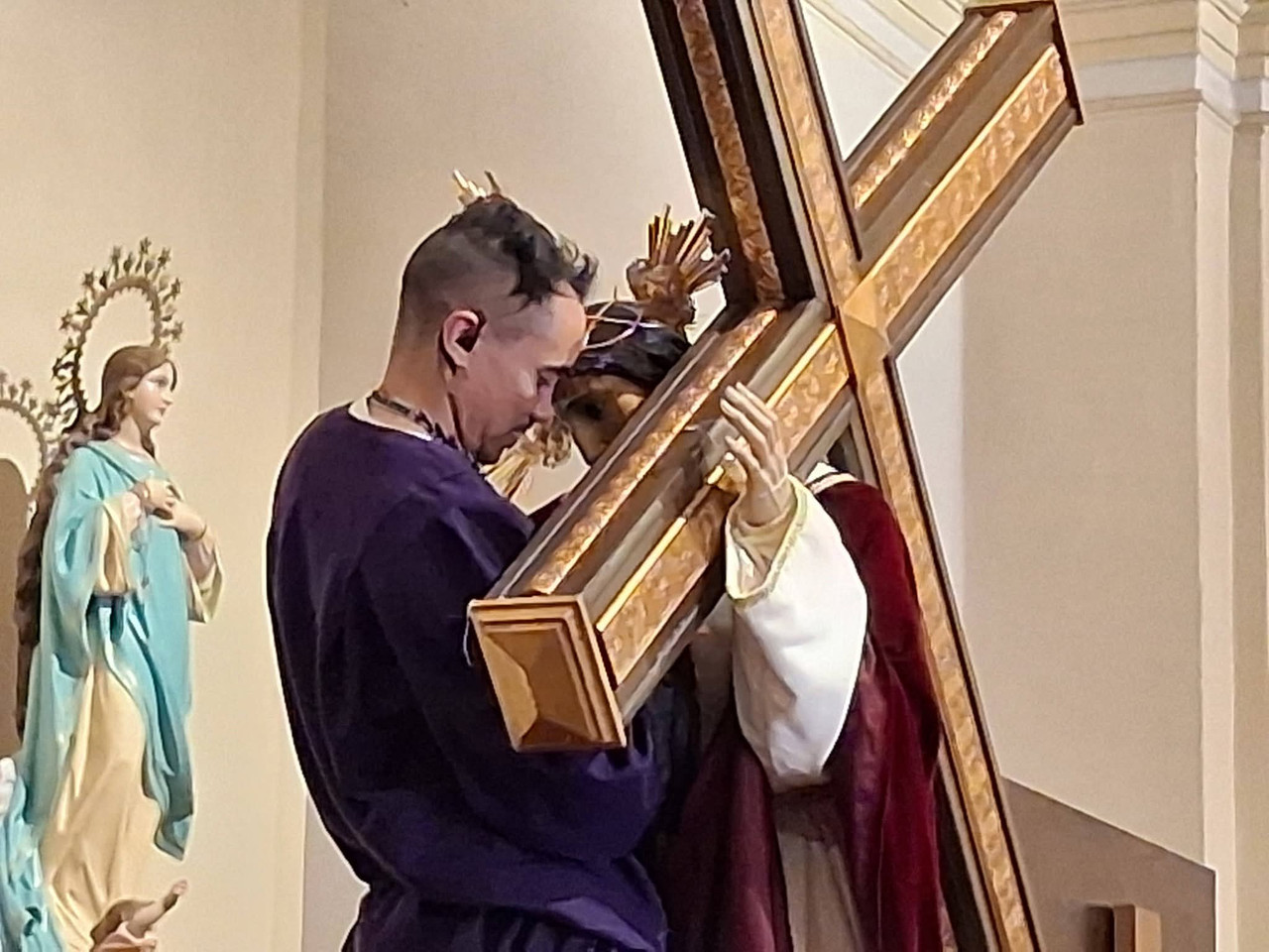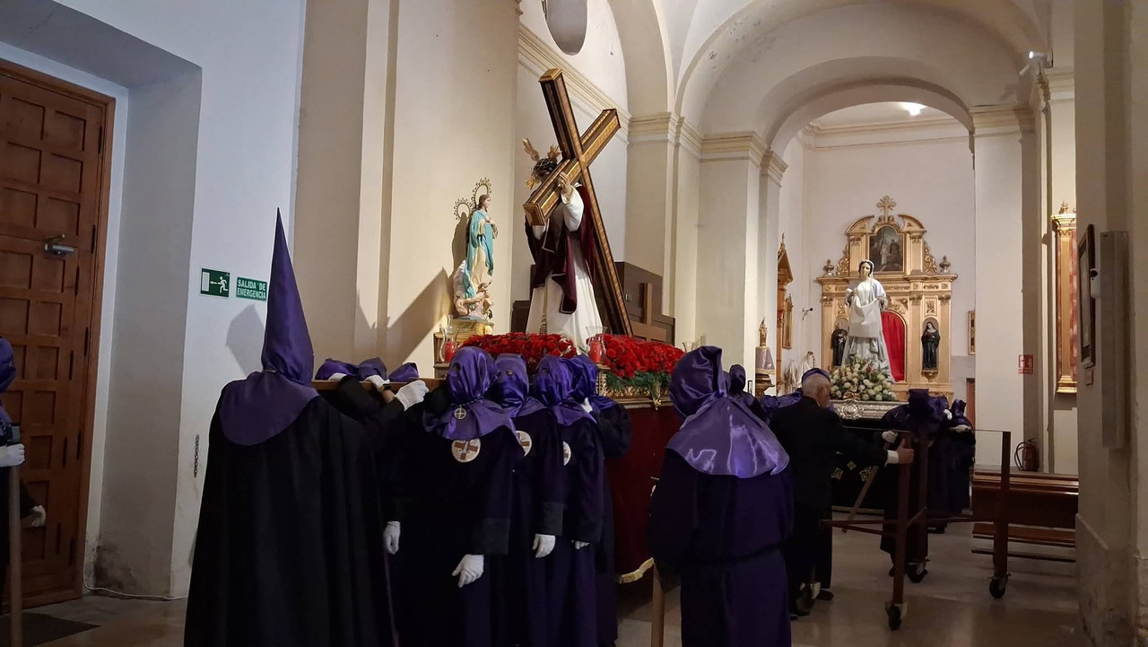 Pero esta hermandad está acostumbrada a que este encuentro se celebre en el interior de la iglesia si la lluvia les impide salir, por lo que no tuvieron excesivos problemas en adecuarse a la nueva situación. Cumplieron el ritual que ya es clásico: el Cristo cae al suelo, la Verónica lo ve, se arrodilla ante él, le enjuga el rostro, y su imagen queda plasmada en el lienzo del pañuelo. Y todo esto ante un público que abarrotaba la plaza en plena mañana del Viernes Santo.