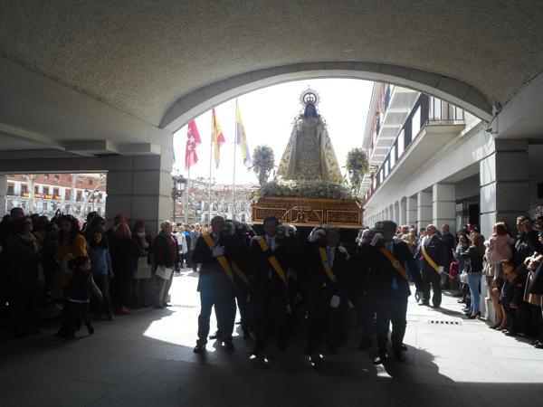 Volviendo a la salida, la Virgen del Rosario, con su enorme manto negro, salía de la Puerta del Sol justo después de que los Caballeros realizasen una primera “levantá” cargada de simbolismo, al dedicársela a Julián Herrero. Tras un corto viaje, la Virgen llegaba al centro de la Plaza donde le esperaba su Hijo para comenzar un largo Encuentro ante un numeroso público. Así, la Virgen se inclinó tres veces ante el Resucitado justo antes de retirar el velo negro que la cubría al mismo tiempo que sonaban las campanas de la iglesia y palomas blancas sobrevolaban el cielo de Torrejón.
