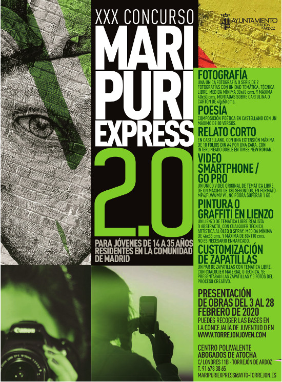 El histórico concurso juvenil Mari Puri Express 2.0 cumple treinta años, y lo celebra con la novedad de ampliar la edad de participación desde los 14 años y vuelve a sumar a la fotografía, poesía y relato corto otras modalidades, como son video smartphone - go pro, pintura o graffiti en lienzo y customización de zapatillas. Las obras podrán presentarse hasta el próximo 28 de febrero en la Concejalía de Juventud (Centro Polivalente Abogados de Atocha en la calle Londres 11-B). Más información en el teléfono: 91 678 38 65 y a través del correo maripuriexpress@ayto-torrejon.es.