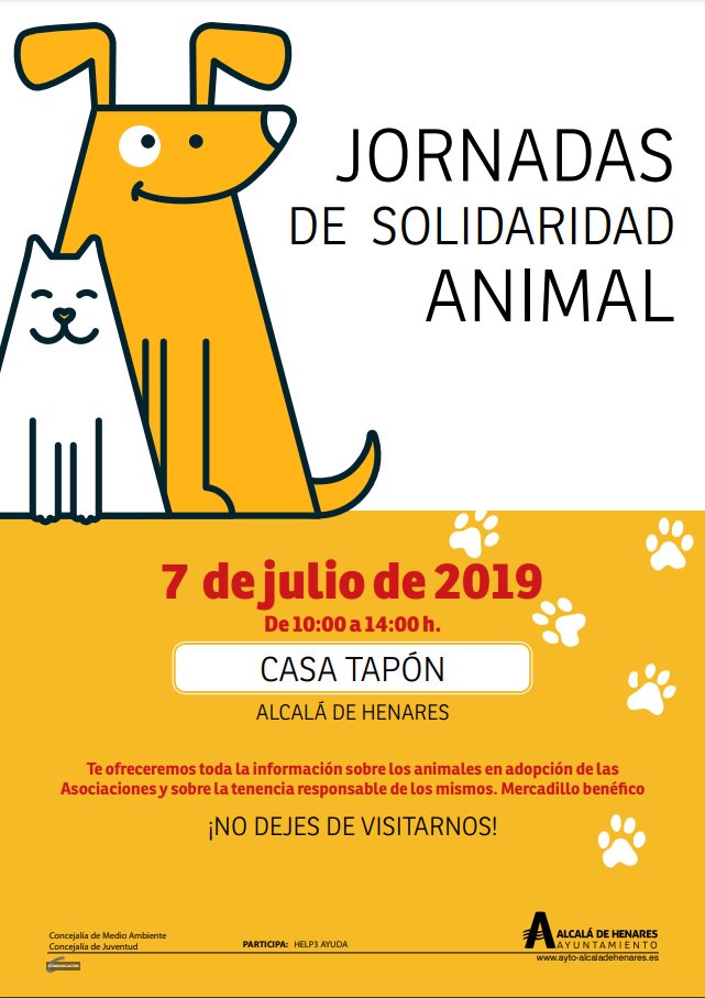 El Ayuntamiento de Alcalá de Henares, a través de la Concejalía de Medio Ambiente, pone en marcha una nueva campaña contra el abandono y el maltrato de animales de compañía. Este domingo 7 de julio de 10:00 a 14:00 horas en el Patio de la Casa Tapón (C/ San Felipe Neri, esquina con Pza. de los Santos Niños), tendrá lugar una nueva edición de las Jornadas de Solidaridad Animal en Alcalá de Henares, promovida por la Asociación Vydanimal Alcalaína.